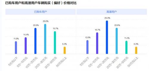 从用户的购车价格分布来看,已购车用户的车辆价格区间集中在10万-50万元(69%),高潜用户则更偏好5万-30万元(71%),根据巨量算数分析,由于热度微型车的关注,10万元以下价格区间的偏好比例提升了6%,且10万-20万元的紧凑级车以其经济性、实用性的融合受到用户的青睐,用户除了尝鲜心态外,需求也逐渐偏向理性。