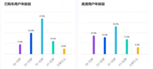 从年龄分布来看,巨量算数数据显示,新能源车的已购车用户主要分布在24-40岁的中坚人群,而高潜用户则表现出对新能源车的购买意愿,年龄段分布逐渐趋于均衡化,尤其18-23岁及41岁以上的人群兴趣度提升明显,受众群体进一步拓宽。