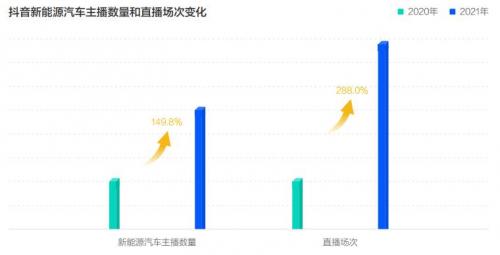 根据巨量算数数据,2021年新能源车主播数量和直播场次较去年均呈现增长态势,尤其直播场次同比增长288%,主播开播意愿强烈。
