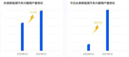 用户对新能源车接受度渐强,关注度显著增加。2021年H2抖音端新能源车兴趣用户在2020年H2高基数的基础上,仍保持约45%的高增速。今日头条2021年H2同比增长约6倍。