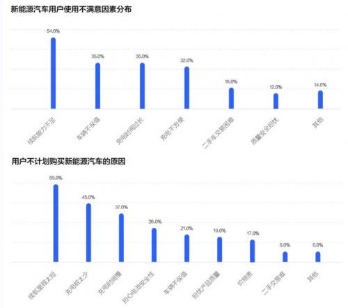 作为新兴的产品,新能源车用户在使用或关注时,依旧存在痛点及担忧。根据巨量算数《2022年中国新能源汽车用户调研》数据显示,用户使用不满意因素及用户不计划购买新能源汽车的主要原因,均集中于续航、充电、安全及保值率等。正是由于用户对新能源车产品的忧虑,也在一定程度上阻碍了增量的释放。