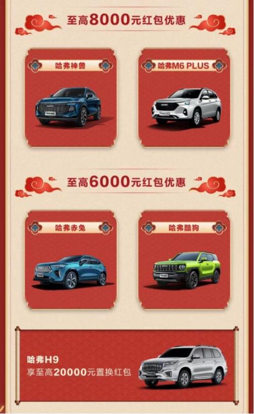 不仅主力产品推出了万元购车红包的超值礼遇,此次新春让利活动期间哈弗品牌旗下的全系产品也均同步送出了幅度不等的现金红包优惠,购买哈弗神兽、哈弗M6PLUS可享至高8000元红包优惠;哈弗赤兔、哈弗酷狗至高6000元红包优惠;购买哈弗H9的用户更有至高20000元置换红包等你领取,绝对是不容错过的购车良机。