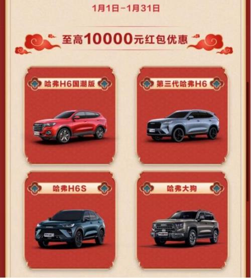 展望全新的一年,哈弗品牌为了回馈用户热爱、激活市场热情,在新春佳节之际在天猫/京东长城汽车官方旗舰店、哈弗智家、抖音哈弗SUV、快手哈弗SUV、汽车之家等线上渠道推出“幸福年哈弗至高万元红包大派送”的新春大促销活动,此次活动期间哈弗旗下多款人气车型均推出了幅度巨大的让利钜惠,助力广大用户启航人生新征程。