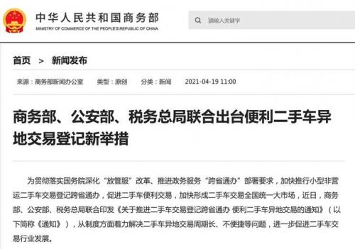 4月19日,我们从中华人民共和国商务部官网了解到,为贯彻落实国务院深化"放管服"改革、推进政务服务"跨省通办"部署要求,加快推行小型非营运二手车交易登记跨省通办,促进二手车便利交易,加快形成二手车交易全国统一大市场。商务部、公安部、税务总局联合印发《关于推进二手车交易登记跨省通办 便利二手车异地交易的通知》(以下简称《通知》),从制度方面着力解决二手车异地交易周期长、不便捷等问题,进一步促进...